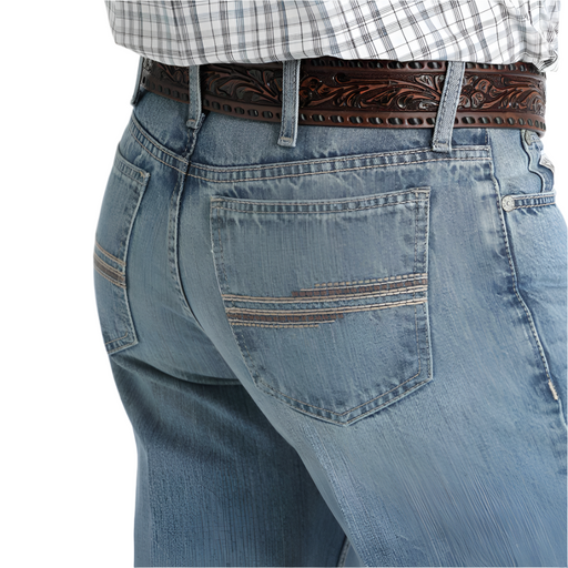 Summerdale Western StoreMedium stonewash white label Cinch men's jean with tan stitching on the back. 13.5 oz Rigid Denim. #MB92834058
