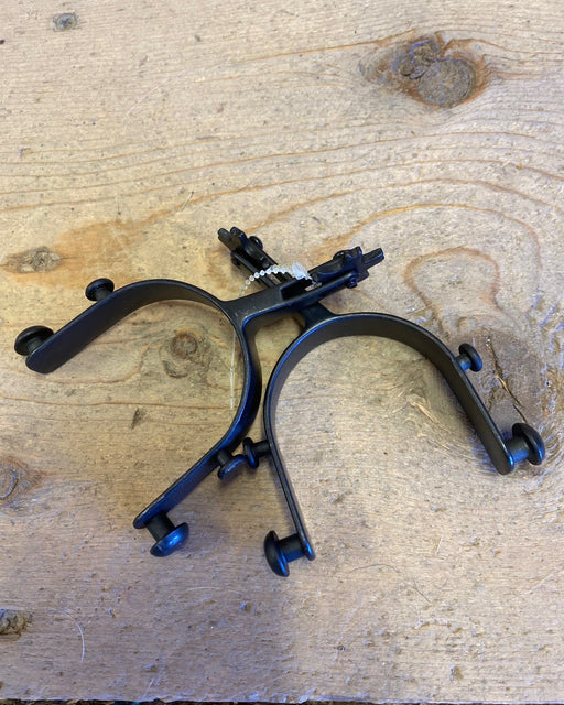 Rowdy RowelsMutton Bustin' Sheep Riding Spur Package Band: 1 Blued steel. Shank: 2, 22-1/2 offset. Rowel: 1 1/4", Split point, 5pt. Harness leather mutton s...