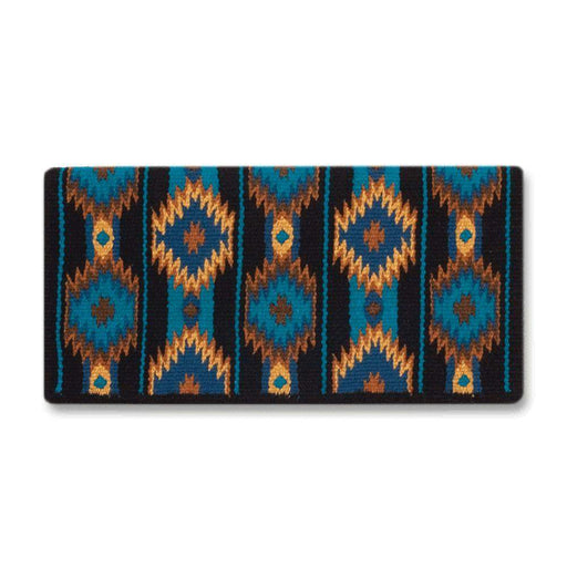 MayatexMayatex saddle blanket 34" long 38" wide Blk/Chest/Ocenblu Teal/Rust/Gold10 Wool blend 2x2 1463-8 1463-8 is a wool blend tightly woven and very d...