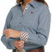 Women's Cinch long sleeve button up blue patterned design with burgundy pattern on the cream cuff.