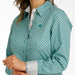 Women's long sleeve button down by Cinch in a teal color with pink and dark teal patterns.