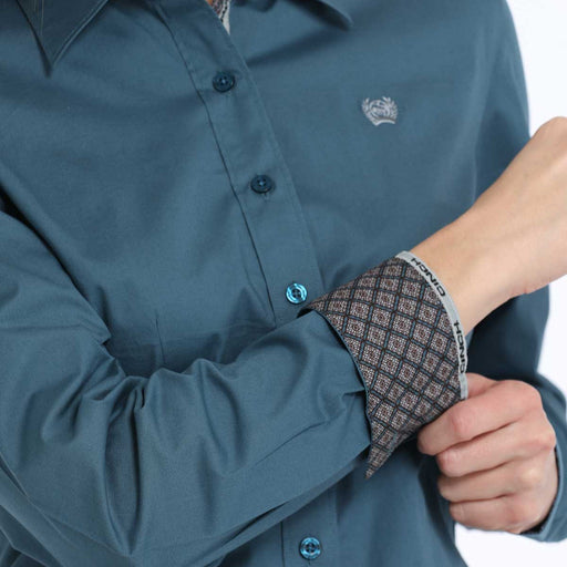 Summerdale Western StoreWomens Cinch teal stretch cotton-spandex long sleeve with buttons. Contrast trim on the cuff. #MSW9165060