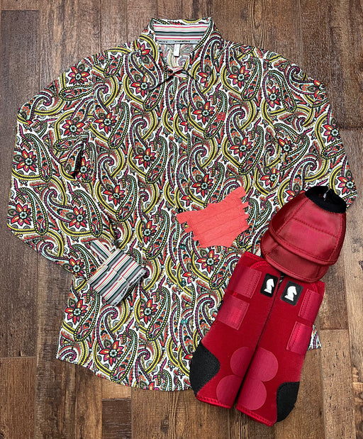 Summerdale Western StoreWomen's long sleeve Cinch button up red, yellow, multi color floral paisley print horse leg boots and flair strip sold seperately #MSW9165031