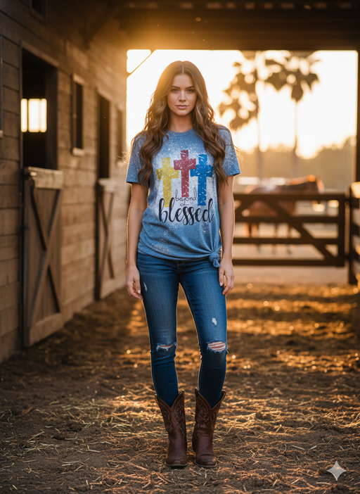 Rowdy RowelsA vibrant expression of faith and style. Our "Beyond Blessed" tee features a beautiful, distressed trio of crosses in sunset yellow, rustic clay, a...