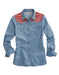 The Tin Haul Women’s Denim Shirt brings a bold Western edge to a timeless classic. Crafted from soft, durable cotton, this shirt features curved front and back yokes pieced with a colorful Aztec print for a vibrant contrast that stands out. The cream pearl snap front and snap cuffs add that authentic Western flair, while the curved pockets and flap details elevate the look with style and practicality.